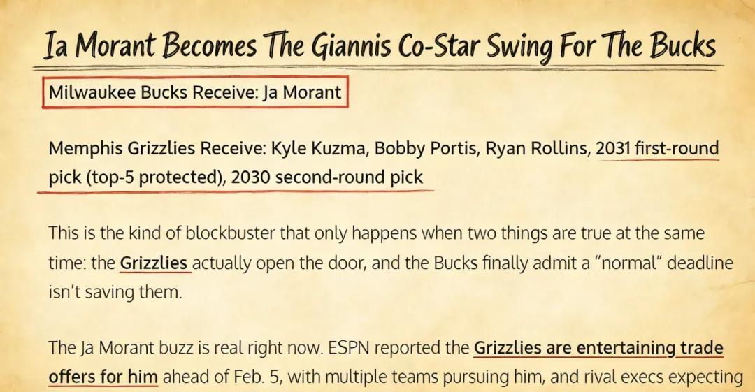 美媒《Fadeaway World》撰文建议,雄鹿应该考虑打包送出库兹马、波蒂斯、罗林斯以及2031年的首轮签(前5保护)、2030年的次轮签,从灰熊引入莫兰特。